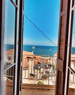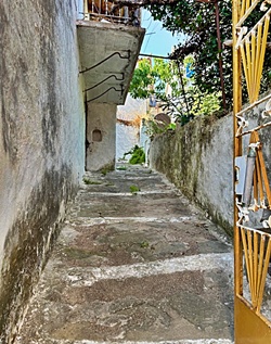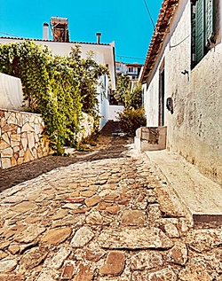 cobbled alley with sneak peaks of the amazing sea views Koroni has to offer. The