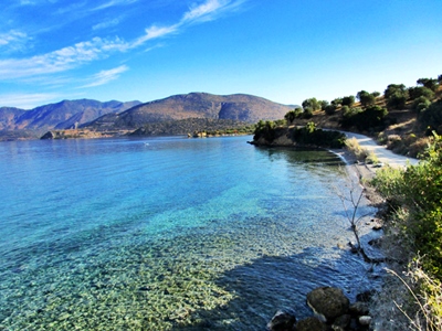 This is a beautiful stretch of coastline which contains luxury villas, looking over to the private Koronis Island and Kilada across the bay.