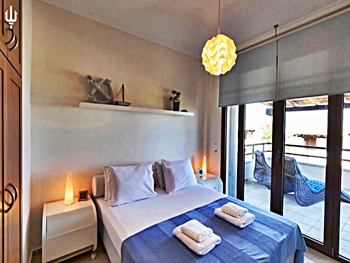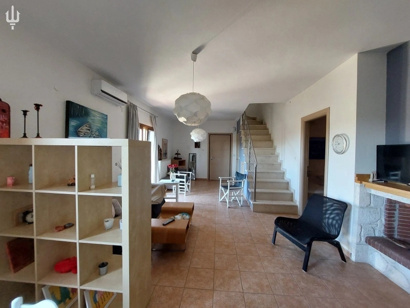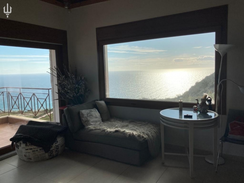 Corner maisonette of 113 sq.m. with unlimited sea view and garden of 1.003 sq.m. Located on a hill in amazing natural environment. It has 3 bedrooms, living room with fireplace, kitchen, 2 bathrooms. It has individual oil heating and is 900 m from the sea and 2 km. from Loutra (spa).