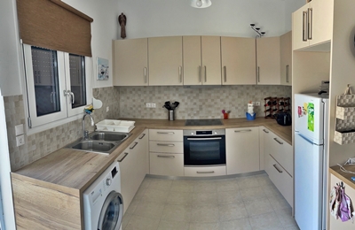 Ground floor is consisted of the open plan living area with the kitchen, one bathroom and 3 bedrooms while on the upper floor there is the master-bedroom with its own bathroom and a huge balcony offering amazing sea views!